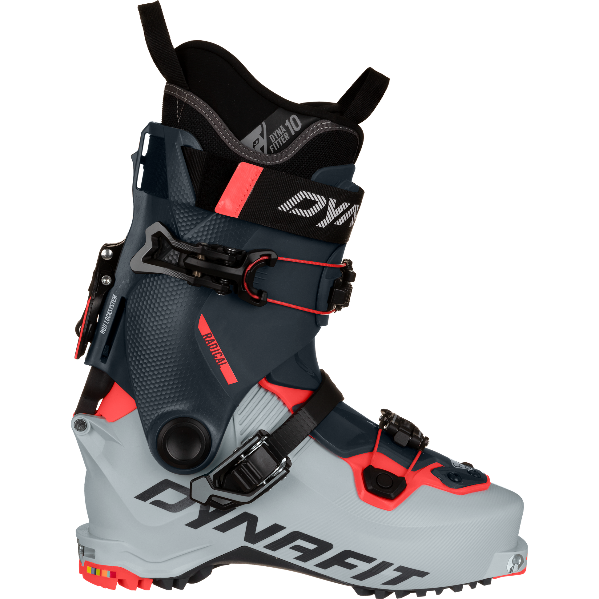 The Radical ski touring boot for women features the revolutionary Hoji Single Lock System and is an uncompromising all-rounder both uphill and down. The women’s version of the Radical boot has the same features as the men’s model, while the fit is specially designed for a women’s foot. The boot – modeled after the Radical Pro model – combines the seemingly contradictory worlds of freedom of movement on the ascent and rigidity for the downhill. In walk mode, the cuff and shell are separated from each other to be able to climb efficiently with a 60-degree cuff rotation for unrestricted, resistance-free mobility. Its low weight of 1,390 g and a flexible tongue construction made of two different high-tech synthetics ensures an energy-saving, natural walking movement even on steep terrain. The new thermo-moldable boot liner (optional) offers stability and comfort with a perfect fit right out of the box. With these on, you will be ready to tackle long tours with many meters of climbing. Once at the summit, the Radical boot becomes a sturdy downhiller with top power transfer, thanks to the one-hand handling for the patented Hoji Single Lock System. Flip the lever of the ski-walk mechanism and the entire system is tensioned, setting the boot in a forward lean angle of 11 degrees. Cuff and shell combine to create a positively locked unit that transforms the revolutionary system into one unit totally without play. A unique feature on the market for precision and efficient skiing of the highest level that was normally seen only in purebred Alpine ski boots. In contrast to the Radical Pro, the Radical’s ski-walk mechanism is not connected with the micro-adjustable buckles and the strap. Rather, these must be secured separately for the descent. They secure the foot safely and firmly, lending a flex index of 100 even on challenging downhill terrain for all-around impressive downhill performance on the skis. The new Radical is compatible with all pin, hybrid and alpine bindings. It is made of dynamic polyurethane and made entirely in Italy. Radical ski touring boot – Either-or is so yesterday