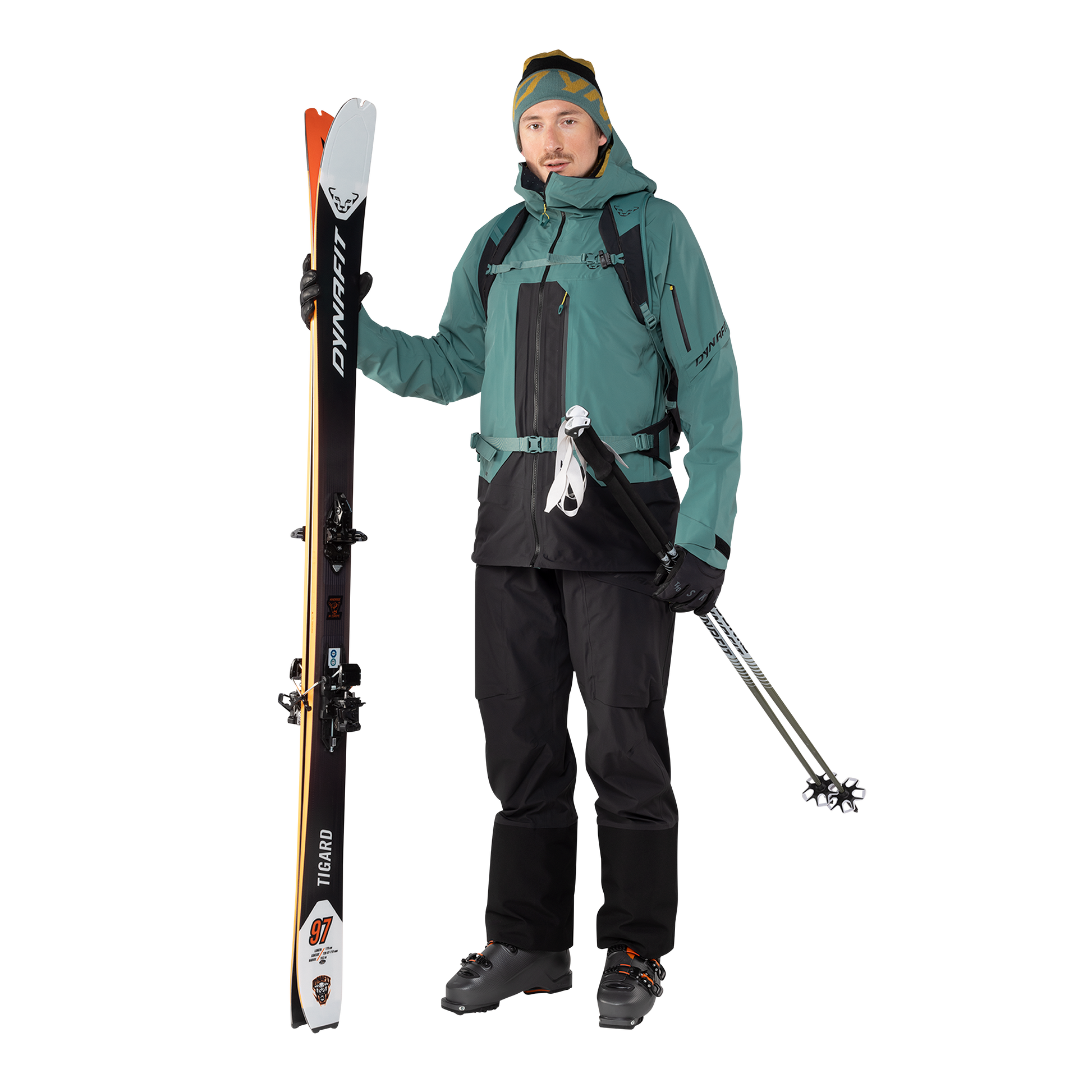 Durable weather protection combined with maximum freedom of movement: The Tigard 3L Stretch Jacket for men is the ultimate companion for backcountry ski touring and freeriding. To ensure you can give your all in powder, your clothes must also protect you ideally. On the climb, high breathability is required so you don’t overheat. At the same time, you must be protected reliably from wind and weather so you get back down the mountain dry and warm. And of course you can only achieve your best performance if you can move freely and your clothes don’t bind. As a mountain athlete, naturally the environment is near and dear to you. That makes the Tigard 3L Stretch Jacket the perfect choice! It is impressive from start to finish, both technically and also when it comes to sustainability. Made of recycled materials, this waterproof, PFC-free jacket guarantees total protection from the elements with its waterproof rating of 20,000 mm. At the same time, it offers outstanding breathability and maximum flexibility with its four-way stretch. Whether climbing up steep terrain or racing down the hill in chest-deep pow, the Tigard 3L Stretch Jacket makes every move you do. It also offers impressive comfort so you can enjoy your tour to the fullest. This stylish freeride jacket features two front pockets and a small sleeve pocket for your ski pass. Cuffs can be adjusted with hook-and-loop closure so snow stays out. A stretch hood is adjustable with one hand and can be worn over your hood in especially unpleasant conditions. Of course there are venting zippers underarm for extra cooling and a powder skirt you can attach to the Tigard 3L Stretch Pant as needed. Tigard 3L Stretch Jacket – everything you need in the backcountry.